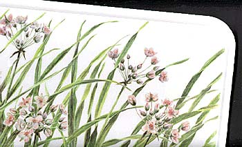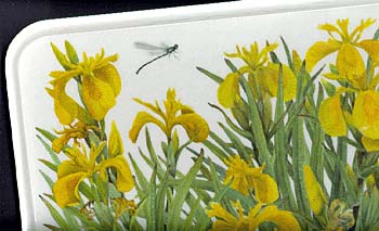 Bricka med motiv av gul svärdslilja. 45 x 30 cm. Hårdplast. Italienskt fabrikat. Grundupplagan såldes till förmån för Tåkernfonden WWF. Utgiven ca 1995.