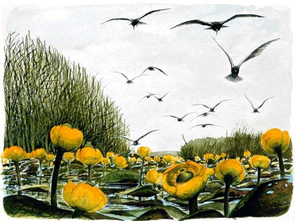 "Svarttärnor och gul näckros"
