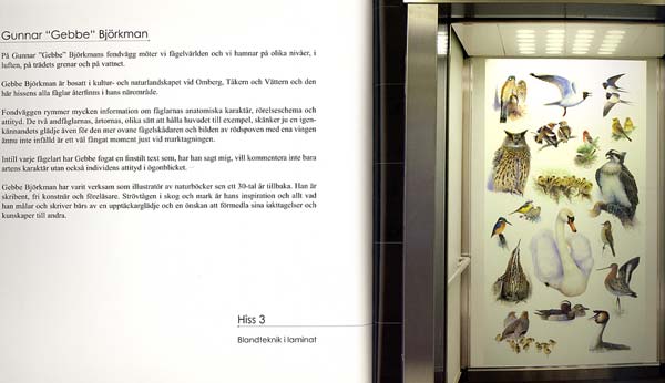 hösten 2004 - Konstnären och konstkonsulten Nils G stenqvist ringer till mig och frågar om jag är intresserad av att medverka i en offentlig utsmyckning av det nya hyset för Onkolgisk vård vid Universitetssjukhuset i Linköping. Sex hissar skall dekoreras med fondväggar med motiv från natur och jag blir erbjuden att göra en om fåglar. Jag tackar med glädje ja.