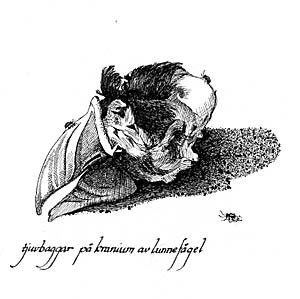 "Kranium av lunnefågel med tjuvbaggar"